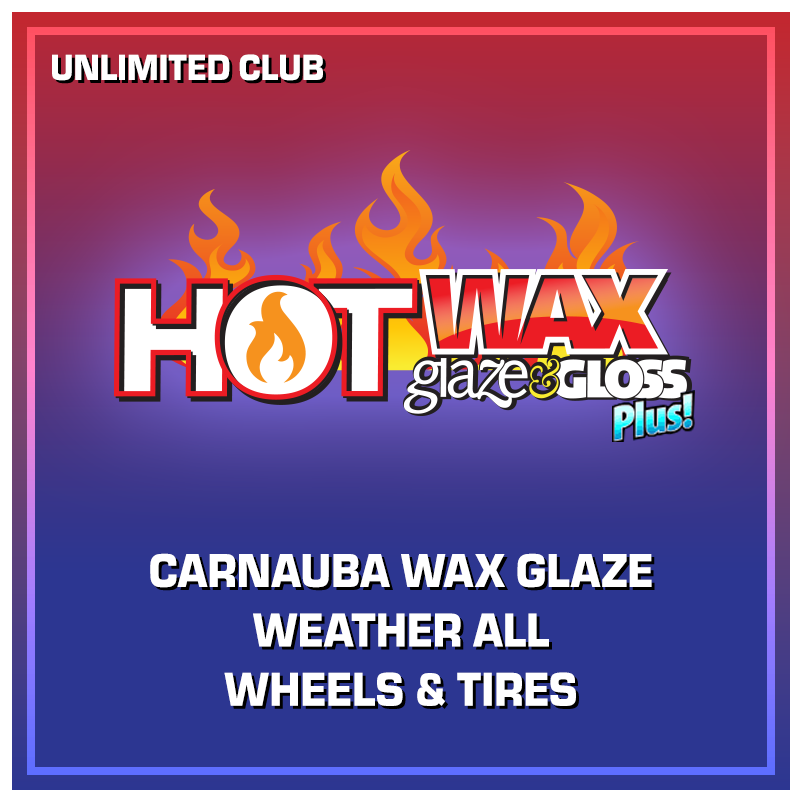 Shine brighter with the Hot Wax Glaze & Gloss Unlimited Wash Club – Featuring Carnauba Wax Glaze, Weather All, and Wheels & Tires cleaning, this package delivers a glossy, polished finish that turns heads. Treat your car to the ultimate in gloss and protection.