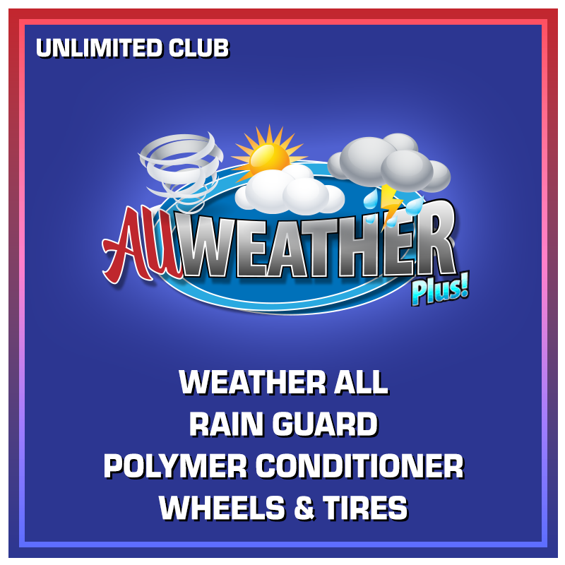 Be ready for anything with the All Weather Unlimited Wash Club – This package includes Weather All, Rain Guard, Polymer Conditioner, and Wheels & Tires cleaning to protect your car from the elements while keeping it looking pristine. Ideal for those who want all-season protection and shine.